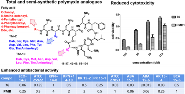 研究团队采用了两种固相全合成和一种选择性液相半合成的方法,分别针对多粘菌素2-Thr 或 10-Thr 进行修饰,合成得到了一系列多粘菌素衍生物。在抗耐药菌活性测试结果中,全合成改造系列衍生物表明,用带有疏水性侧链的氨基酸取代2- / 10-Thr可以保持较好的抗铜绿假单胞菌的活性;而半合成改造系列衍生物表明,2- / 10-Thr上的氨基乙酰基酯化具有优异的抗菌活性,其中化合物76对不同菌株的活性高了2-8倍,且对HK-2细胞的毒性也较低(图1)。这些数据为进一步发展基于多粘菌素改造的新型抗生素研发奠定了基础。