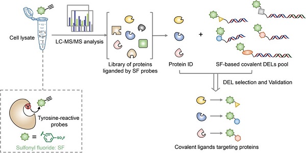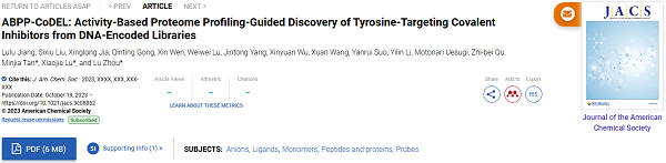 2023年10月20日,中国科学院上海药物研究所陆晓杰研究团队和谭敏佳研究团队联合复旦大学药学院周璐团队共同在《美国化学会志》(JACS)上发表了题为“ABPP-CoDEL: Activity-Based Proteome Profiling-Guided Discovery of Tyrosine-Targeting Covalent Inhibitors from DNA-Encoded Libraries”的文章,开发了结合基于活性的蛋白质组分析(Activity-based Protein Profiling, ABPP)技术和DNA编码化合物库(DNA Encoded Library, DEL)技术的“ABPP-CoDEL”技术用于共价苗头化合物的发现,并应用该方法为一系列蛋白找到了靶向酪氨酸的共价苗头化合物。