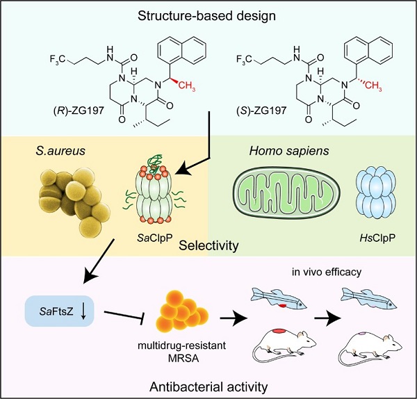 ClpP是原核和真核生物中高度保守的ATP依赖的丝氨酸水解酶,负责调控蛋白质稳态。生理状态下,ClpP通过与伴侣蛋白例如ClpX形成ClpXP复合体发挥水解酪蛋白的功能。小分子激动金黄色葡萄球菌ClpP(SaClpP)异常降解关键蛋白质,是抗生素发现的新策略。由于异常激活人源ClpP (HsClpP)可引起线粒体蛋白稳态失调从而产生细胞毒性,因此理想的靶向性激动SaClpP的抗生素研究必须充分避免对线粒体HsClpP产生干扰。然而,目前尚未见选择性的SaClpP激动剂被报道。