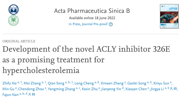 2022年6月18日,中国科学院上海药物研究所南发俊课题组和李静雅课题组合作在Acta Pharmaceutica Sinica B上发表文章“Development of the novel ACLY inhibitor 326E as a promising treatment for hypercholesterolemia”,在高胆固醇血症靶向治疗策略中取得重要进展。
