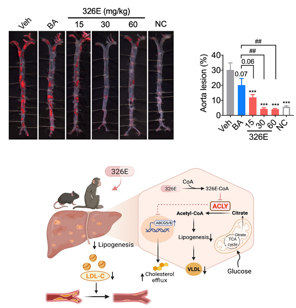图1. 新型ACLY小分子抑制剂326E改善高胆固醇血症及作用机制示意图
