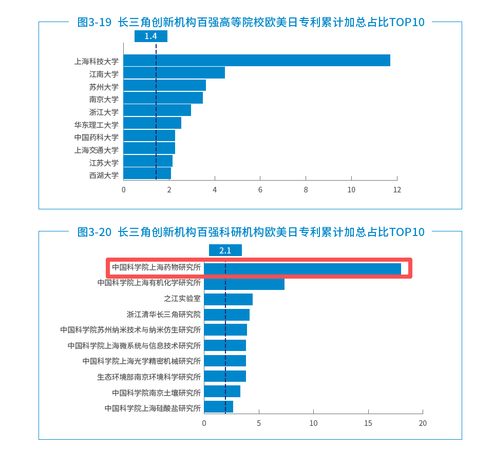 根据《长三角区域创新机构发展研究报告》(2019-2023),对江浙沪皖的高等院校、科研机构的创新产出——专利进行分析,并从发明数量、发明质量、影响力、协同创新、全球化等5个维度评估,上海药物所稳居第一梯级;其中全球化指标中,上海药物所连续五年蝉联第一,以2023年为例:欧、美、日专利累计加总占比近18%,远超入选100强的均值水平(高校1.4%、科研机构2.1%)。