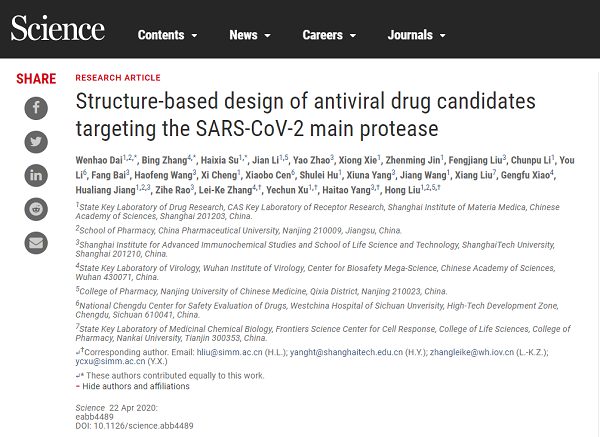 近日,中国科学院上海药物研究所柳红/许叶春/蒋华良团队联合上海科技大学杨海涛/饶子和团队和中国科学院武汉病毒所张磊砢/肖庚富团队通力合作,在抗新型冠状病毒药物研究中取得重要进展,发现一类结构新颖、高效、安全的抗SARS-CoV-2病毒候选药物。该研究成果于3月28日发表在生物预印本网站bioRxiv上,并于4月22日在Science上在线发表。