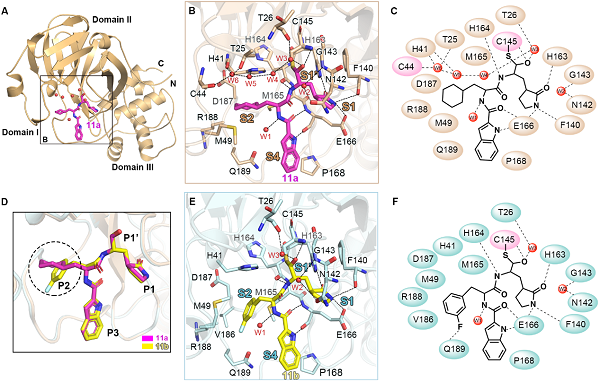 化合物11a和11b与SARS-CoV-2主蛋白酶复合物的三维结构显示这两个化合物均占据底物结合口袋,其中化合物的醛基和蛋白酶催化位点145位半胱氨酸残基形成共价键,牢牢地将其锁住。高分辨的复合物结构信息不仅展示了化合物11a和11b与主蛋白酶精确的互作模式,还揭示了化合物抑制病毒蛋白酶的分子机制。