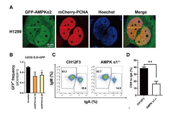 单磷酸腺苷激活的蛋白激酶AMPK是细胞中重要的能量感受器和调节器,在调控糖脂代谢、细胞生长、细胞极性、细胞有丝分裂和细胞凋亡等多种生命活动中发挥着重要作用。近年来,陆续有报道指出AMPK可能参与DNA损伤修复这一重要的生命过程,但具体作用机制不明。