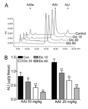 马兜铃酸(AA)是马兜铃酸肾病(aristolochic acid nephropathy, AAN) 和巴尔干地方性肾病(Balkan endemic nephropathy, BEN)的致病原因,已经引起了国际上的高度重视。氧化和还原是AAI(AA的主要毒性成分)在不同物种体内快速清除必不可少的代谢过程。然而哪些酶参与AAI体内的氧化、还原代谢以及此代谢过程在AAI肾毒性中的作用尚不明确。上海药物所安评中心前期的研究工作表明肝脏CYP1A参与AAI的氧化代谢,此代谢过程使小鼠血液及肾脏中AAI的含量降低继而减轻AAI所致的肾毒性。该研究结果已在Kidney Int(2008,73:1231-1239)杂志上发表。