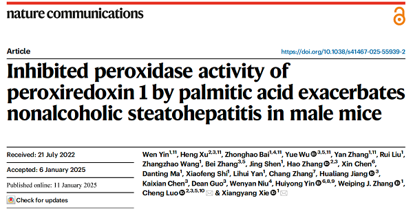近日,中国科学院上海药物所罗成实验室与天津医科大学朱宪彝纪念医院内分泌研究所谢向阳教授实验室组成联合团队,合作发现并确证饱和脂肪酸棕榈酸(palmitic acid, PA)通过上调肝脏活性氧水平,加重NASH的新靶标为过氧化物还原酶1(peroxiredoxin 1, PRDX1)。经体外的分子结合、酶活性确证以及细胞水平的酶活性、活性氧检测实验研究发现,棕榈酸是过氧化物还原酶1的酶活性抑制剂。以上结果提示增强PRDX1的过氧化物酶活性是缓解非酒精性脂肪性肝炎(NASH)的一种潜在方法。相关研究成果于2025年1月6日以“Inhibited peroxidase activity of peroxiredoxin 1 by palmitic acid exacerbates nonalcoholic steatohepatitis in male mice”为题在线发表于Nature Communications。