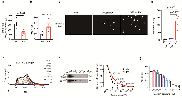 图1. 棕榈酸结合并抑制PRDX1酶活性