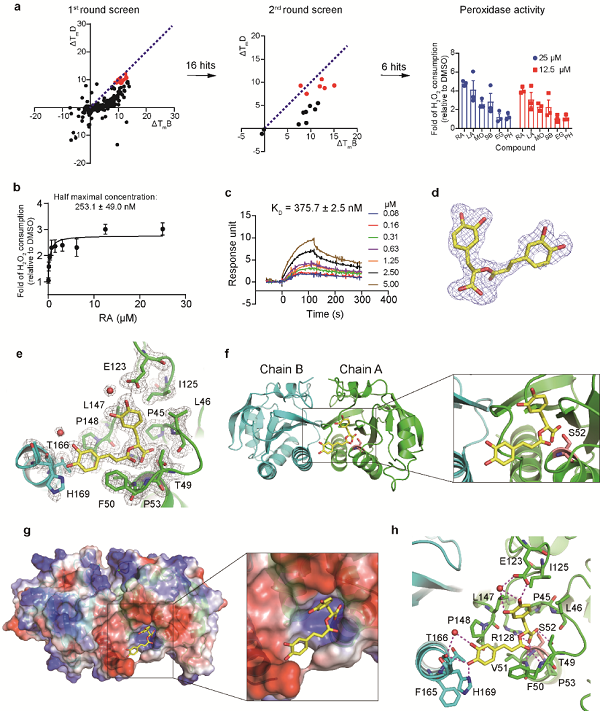 后续通过基于蛋白质热位移测定的化合物库筛选和基于过氧化物酶活性测定的验证,该团队发现并确证了迷迭香酸(RA)是PRDX1的激动剂,其活性约为253.1 nM。该团队进一步解析了RA与PRDX1的复合物结构。复合物结构显示,RA结合在PRDX1的酶活性催化口袋中,一分子RA结合两分子PRDX1蛋白。RA与PRDX1残基结合形成含12根氢键的氢键网络,RA与关键的T49、F50、V51、S52的氢键相互作用稳定酶活催化四联体,且通过羧基桥连R128与CP52残基形成盐桥,稳定活性位点并促进H2O2的结合。以上结果提示RA与PRDX1活性位点之间形成的氢键网络有助于激活PRDX1的过氧化物酶活性。此外,该团队还发现RA剂量依赖性地降低重组野生型PRDX1的超氧化失活形态水平(PRDX1-CP52SO3)。表明RA可能通过减少PRDX1的超氧化失活态稳定其过氧化物酶活性。