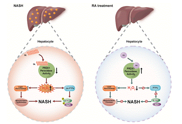 图3. PRDX1作为NASH潜在靶标及RA调节NASH作用的工作示意图