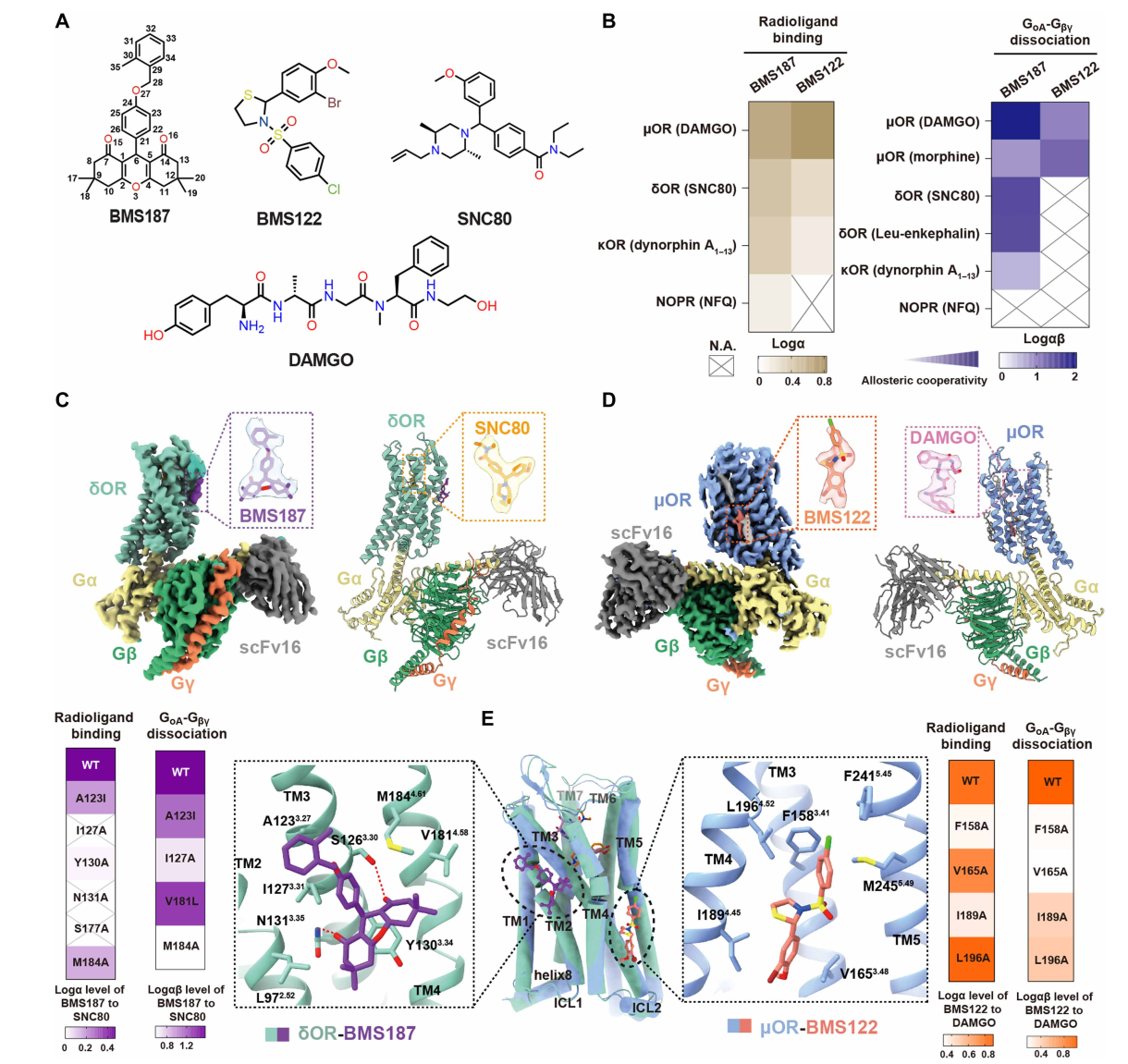 A:所用配体的化学结构;B:定量比较两种PAM在不同阿片受体/不同激动剂条件下的变构“协同增效因子”;热图颜色越深表示协同越强。C–D:δOR复合物与μOR复合物的冷冻电镜密度与整体结构示意图;E:两个结构叠合后显示 BMS187与BMS122在受体中的结合口袋/方式并不相同;并结合突变数据支持各自关键相互作用位点。