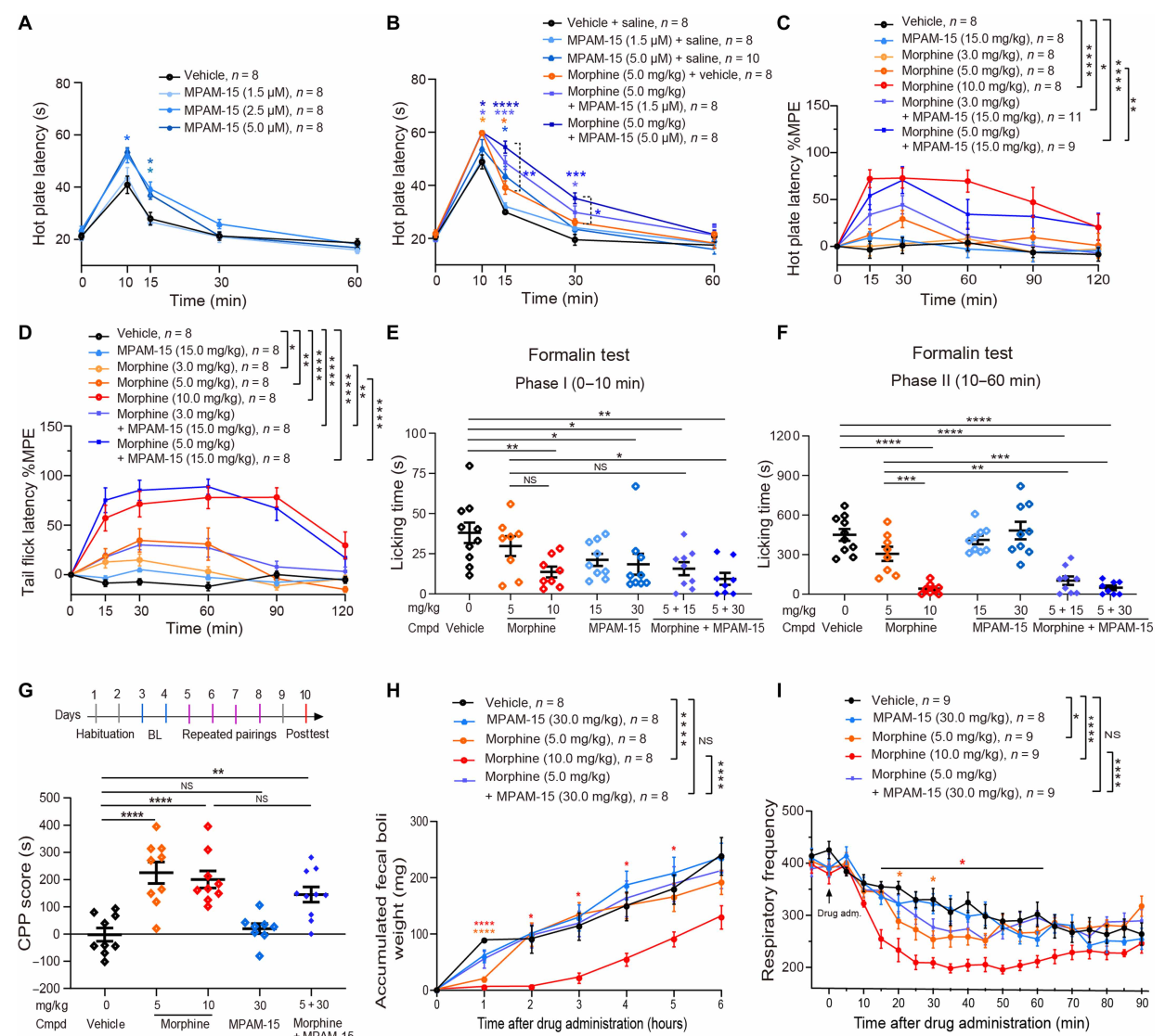 图3. MPAM-15显著增强吗啡镇痛效果,无明显副作用加剧。A:MPAM-15单独使用时在热板实验中的剂量依赖性镇痛效应;B-F:MPAM-15 与吗啡联合使用时在热板实验、甩尾实验以及福尔马林诱导的痛觉反应实验中均显著增强镇痛效应;G:条件位置偏好测试显示,MPAM-15与吗啡联用组的成瘾性评分较低,表明MPAM-15 未显著增加成瘾风险;H-I:MPAM-15与吗啡联合使用后显示该联合用药方案未加剧便秘(H),也未加重呼吸抑制(I)。
