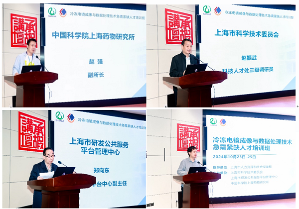 2024年10月23日-25日,上海药物所公共技术中心冷冻电镜平台举办“上海市专业技术人才知识更新工程——冷冻电镜成像与数据处理技术急需紧缺人才培训班”。本次培训由上海市人力资源和社会保障局、上海市科学技术委员会以及上海市研发公共服务平台管理中心指导支持,旨在培养更多冷冻电镜领域的专业技术人才、更新专业技术人才的知识结构、推动冷冻电镜成像与数据处理技术的进一步发展。来自上海市多个科研院所、高校、医院及企业的100余名专业技术人员参加培训。