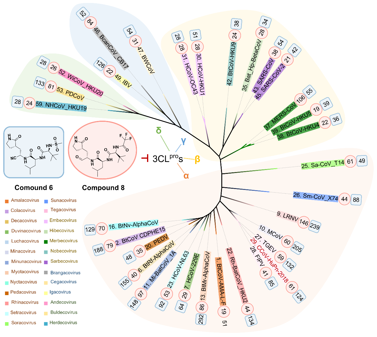 3CL蛋白酶因其在冠状病毒复制中的核心作用和高度保守性,被公认为广谱抗冠状病毒药物的理想靶点,已有多个3CL蛋白酶抑制剂获批上市。但本研究首次表明:目前已获批的药物(如奈玛特韦、先诺特韦、恩赛特韦)虽然对β属冠状病毒3CL蛋白酶有效,但在面对其它属类(α、γ、δ)冠状病毒3CL蛋白酶时,其抑制效率显著下降,尤其是针对上述新发现的可感染人的PDCoV和CCoV-HuPn-2018的3CL蛋白酶抑制效率极为微弱。因此,为应对日益复杂的冠状病毒谱系,并储备能抵御未知变异毒株的候选药物,开发能覆盖全谱系“超广谱”3CL蛋白酶抑制剂十分必要。