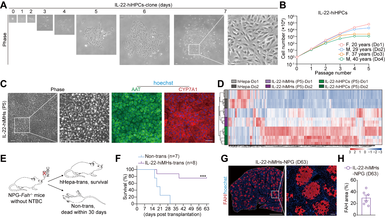 进一步的研究发现,包含IL-22的培养体系同样能诱导人原代肝细胞去分化为可增殖的肝祖细胞(IL-22 induced human hepatocyte progenitor cells,IL-22-hiHPCs)。单克隆增殖实验表明,单个IL-22-hiHPC可在7天内增殖至超过600个细胞。IL-22-hiHPC可连续传代5次左右,在约30天内,细胞数目累计扩增10³至10⁴倍(根据供体不同)。来自两位年龄小于30岁的年轻供体的肝细胞表现出更强的增殖能力,在30天内扩增超过6×10⁴倍(图2)。IL-22-hiHPCs可分化为成熟的肝细胞(IL-22 induced human mature hepatocytes, IL-22-hiMHs),高表达AAT、CYP7A1等肝细胞标志蛋白(图2)。将IL-22-hiMHs移植至免疫缺陷型Fah-/-小鼠(NPG-Fah-/-小鼠)肝脏后,IL-22-hiMHs能显著提高NPG-Fah-/-小鼠的存活率,并在移植60天后重建NPG-Fah-/-小鼠30%以上的肝脏(图2)。