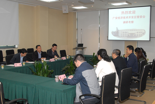 2015年3月27日上午,四川省广安市岳池县张学谦副县长、广安经济开发区医药产业园区党工委副书记、管委会主任胡伟一行访问上海药物所。药物所副所长叶阳、药物化学研究室主任段文虎、合作与成果转化处处长关树宏等参加会议。