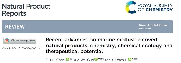 https://pubs.rsc.org/en/content/articlelanding/2022/np/d2np00023g)后,本年度第二次应邀以“Recent Advance on the Marine Mollusks-derived Natural Products: Chemistry, Chemical Ecology and Therapeutical Potential”为题,对过去十年间国际上报道的海洋软体动物来源的次生代谢产物的化学结构类型、化学生态学效应、药理活性等方面进行了系统、全面的综述。该文在2022年8月8日被最新一期