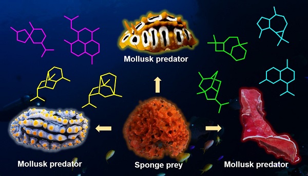 海洋软体动物,尤其是复足纲后鳃亚纲裸鳃目生物,是一类色彩艳丽、移动缓慢、没有坚硬外壳保护的底栖无脊椎动物,又被称之为“海洋蝴蝶”(marine butterfly)。这些软体动物由于失去了坚硬物理外壳的保护,为了进化生存,它们“聪明的”发展出了一种化学防御策略,即代谢产生出一系列小分子化合物作为“化学武器”,用于抵御上游食物链动物的捕食而生存。这一现象为科研人员提供了一条有别于传统方法从自然界寻找具有生理活性药物先导化合物的筛选模型。近年来,软体动物与其上、下游食物链生物之间的化学生态学关系(Prey-predator relationship)成为海洋天然产物研究的前沿热点。许多软体动物产生的次生代谢产物被发现具有重要生态学意义及特殊的生物学功能,从而使得它们与其食源生物之间的化学生态学关系得以阐明。同时,具有化学防御功能的小分子化合物也显示出新颖化学多样性和广泛生物活性而被进行药物相关的开发研究。软体动物已经成为海洋新药研究中的一类重要药源生物。