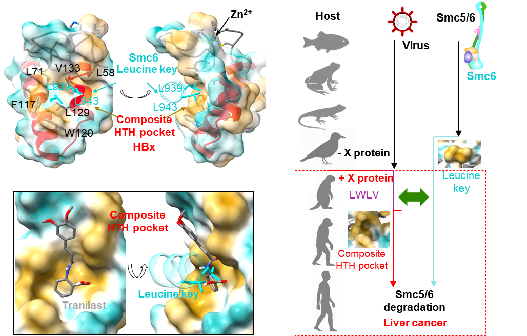 Smc5/6复合物在基因组稳定性维持及DNA损伤修复中亦发挥重要作用。哺乳动物感染嗜肝病毒后,其X蛋白介导的Smc5/6降解可导致基因组稳定性受损;此外,慢性感染患者中HBV基因组整合至宿主基因组的比例近乎100%,这些整合的基因可持续表达不同长度的HBx截短突变体,其中带有组成型HTH口袋的突变体可维持对Smc5/6的降解能力。序列比对显示,构成HBx组合型HTH疏水口袋的氨基酸残基在所有HBV基因型乃至数千年前的古代HBV株中均完全一致。嗜肝病毒的进化分析表明,X基因出现于哺乳动物肝炎病毒中,且该疏水口袋高度保守;从宿主角度看,Smc6上的“亮氨酸钥匙”在鸟类中即已出现,并在哺乳动物中完全保守,提示二者存在共进化关系。这与仅在受感染哺乳动物中出现原发性肝细胞癌的表型一致,表明X介导的Smc5/6降解可能对肝细胞癌发生具有重要影响。阻断HBx-Smc6相互作用,有望成为抑制病毒复制并延缓肝炎向肝细胞癌转化的潜在新靶点。