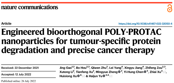 针对上述挑战,于海军课题组2022年7月26日在Nature Communications发表了题为“Engineered bioorthogonal POLY-PROTAC nanoparticles for tumour-specific protein degradation and precise cancer therapy”的研究论文,该研究在于海军课题组前期发展多种肿瘤微环境响应的智能递药系统基础上(Adv Mater, 2020. 1907210; Adv Mater 2021, 2101155; Adv Mater, 2021, 2102668.),创新性提出了一种聚合物化PROTAC(POLY-PROTAC)纳米治疗策略,实现了肿瘤特异性PROTAC递送和蛋白降解。研究成果展示了POLY-PROTAC精准降解目标蛋白以及基于PROTAC的高效肿瘤治疗前景。