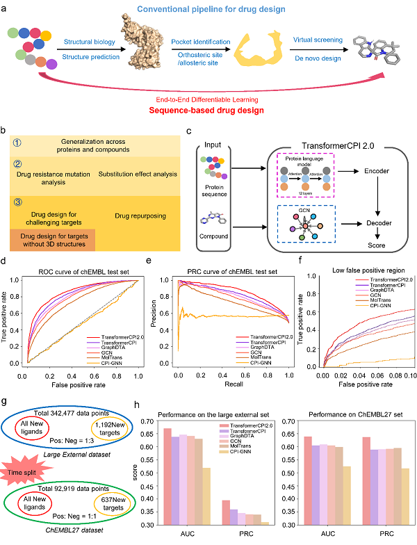 图1. 基于序列的药物设计方法TransformerCPI2.0。a,基于结构药物设计与基于序列药物设计的流程对比。b,“从序列到药物”概念验证的三个阶段,包括:①评价跨蛋白质和化学空间的泛化能力(计算验证);②通过耐药性突变和取代基活性悬崖效应的预测检验模型是否学习到蛋白质-配体相互作用知识(可解释性分析);③开展具有挑战性的虚拟筛选和药物重定向预测(实验验证)。c,TransformerCPI2.0的架构。