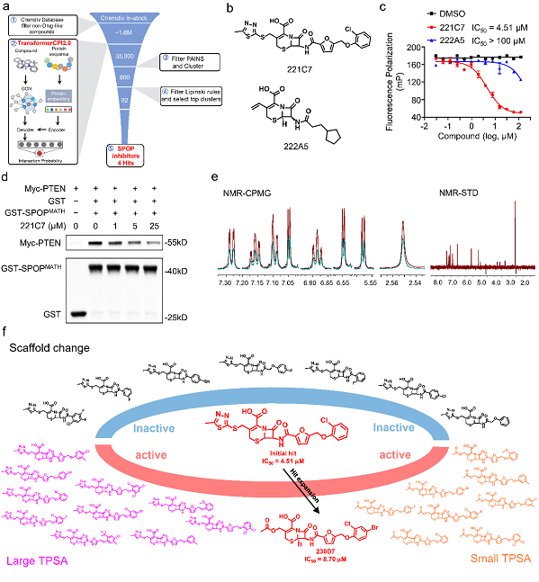 图2. 利用TransformerCPI2.0基于蛋白质序列发现新骨架SPOP抑制剂。