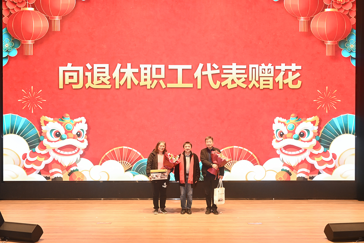 李佳向荣休职工代表赠花,左建平代表发言